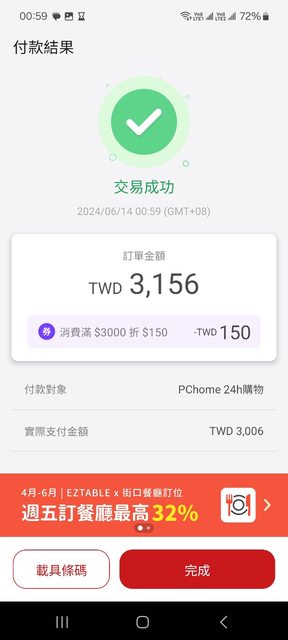waakye: 3000折150前幾天PCHOME日的啦。當時5%沒114.24.137.211 06/18 00:16