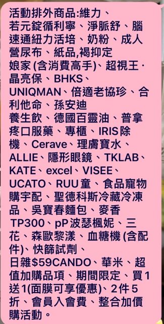 附近康是美群組小編問到了排除名單,如下圖,但很經典的買一送一、Cerave排除,
