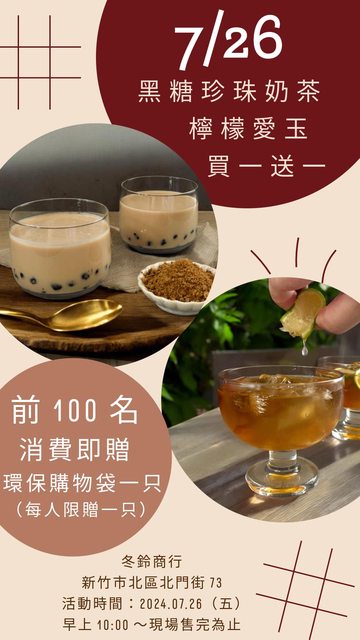 優惠 : 7/26,黑糖珍珠奶茶(65)、檸檬愛玉(55)買一送一