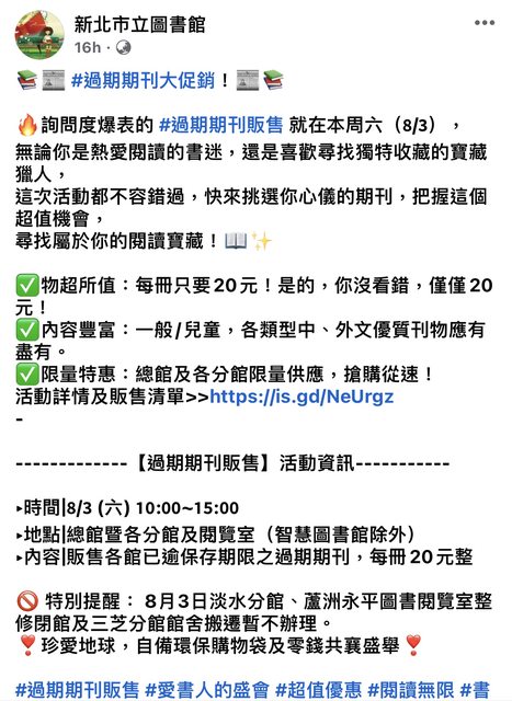 很多英文、日文雜誌,其實很少人翻閱,書況很好。一本才$20而已,不到一元美金,原文雜 誌原價應該蠻貴的。 https://www.facebook.com/share/p/iKkjnqsRjPPi8qdm/? -- ※ 發信站: 批踢踢實業坊(www.ptt-web.org.tw), 來自: 61.228.143.214 (臺灣) ※ 文章網址: https://www.ptt-web.org.tw/Lifeismoney/M.1722559169.A.1FD
