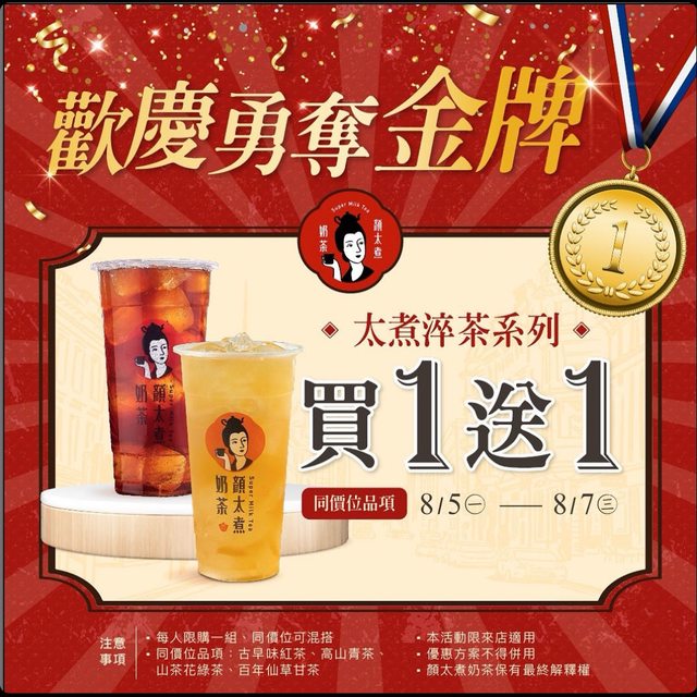 狂賀羽球「麟洋配」勇奪金牌! 顏太煮奶茶全台門市 #連3天 「買1送1」 8/5-8/7至全台門市可享 「太煮淬茶系列 買1送1」 每人限購一組,限來店購買 相同價格品項可混搭(古早味紅茶、高山青茶、山茶花綠茶、百年仙草甘茶) 顏太煮奶茶保有修改、解釋、終止活動之權益 https://i.imgur.com/DivhXC0.jpeg