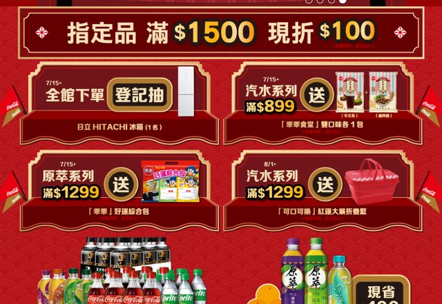 1.指定品滿$1500現折$100 2汽水指定品滿$1299送可樂摺疊籃 24入(箱)的雪碧、可樂基本上都算是全年最低價, 猜可能順便主打普渡拜拜的訴求 有拜拜需求的可以買這種 https://reurl.cc/qv8Wan https://i.imgur.com/o6ZxycA.jpeg
