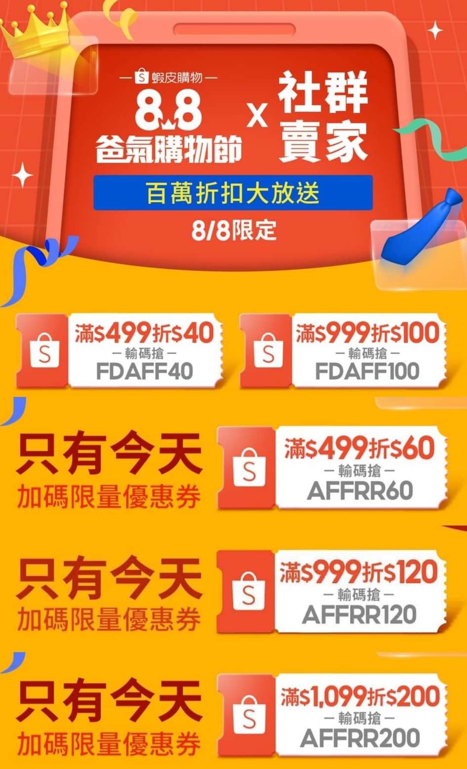 88節蝦皮優惠碼 FDAFF40滿499折40 FDAFF100滿999折100 LUVDAD88滿888折88 7VTP559DAC滿100-20 有拿到新的再補充 -- ※ 文章網址: https://www.ptt-web.org.tw/Lifeismoney/M.1723001878.A.4FC