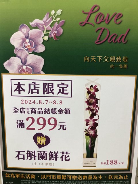 今明兩天,石斛蘭是父親節之花,單賣188元 雖然寫單店活動,但經過好幾家門市都有看到 應該是有賣花的店就有,蠻好看的約30公分 送人或擺家裡挺不錯的,香氣迷人照顧不難 https://i.imgur.com/TBylyGQ.jpeg