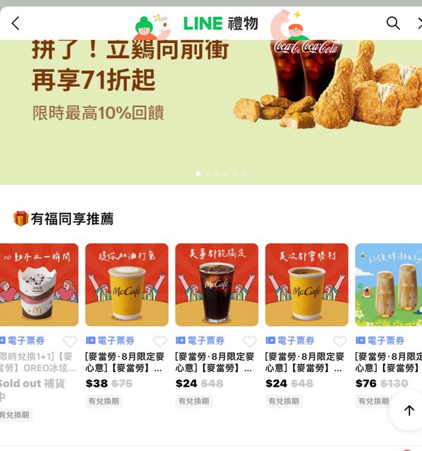 剛在line禮物上看到的 麥當勞那提中杯特價38元,美式咖啡特價24元 冰蜂蜜奶茶兩杯76元,兩杯冰蜂蜜紅茶66元 https://i.imgur.com/roeAKIn.jpeg