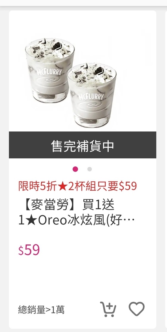 【麥當勞】買1送1★Oreo冰炫風(好禮即享券)【59元】 https://momo.dm/3vevER 一組帳號限購一個。 建議可以順道買電子秤(咦?) -- Sent from nPTT on my iPhone 15 Pro Max -- ※ 發信站: 批踢踢實業坊(www.ptt-web.org.tw), 來自: 42.70.87.232 (臺灣) ※ 文章網址: https://www.ptt-web.org.tw/Lifeismoney/M.1723079160.A.D83