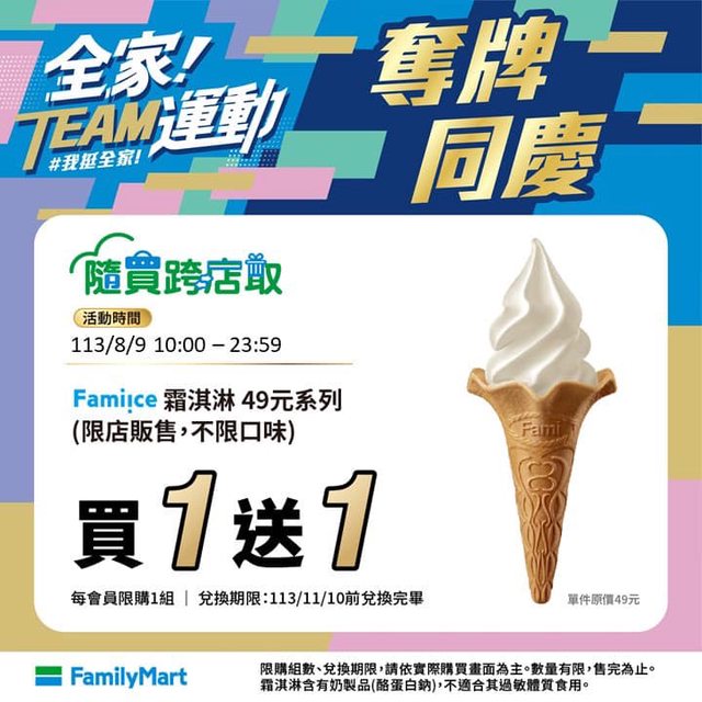 可能有人還沒注意到 本來還有一組沒換完,想說等到自動退錢包好了,今天去看錢包沒退款 才發現霜淇淋兌換期限自動延長至113/9/10了 不過明天8/9開始又有霜淇淋買一送一了(非跨店取) https://nevent.family.com.tw/FamilyMartBestDiscount/ 全家最近真的狂推霜淇淋促銷 更新 今天8/9也可跨店取了 https://i.imgur.com/buDYIL1.jpeg