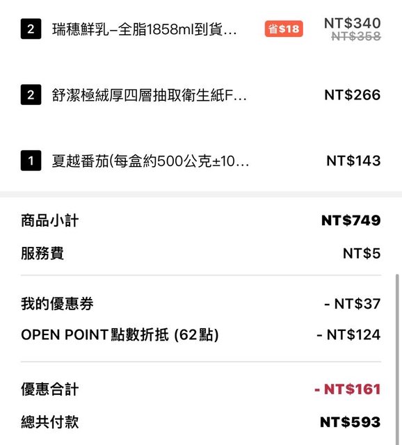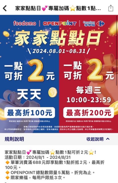 : 8/1-8/31 : 1.家樂福單筆滿額688元結帳使用openpoint點數1點折抵2元(每筆最高折100元) : 每週三使用家樂福外送滿額688元結帳使用openpoint點數1點折抵2元(每筆最高折200元 ) : 2.首購輸入【家家省200】新客400-200 : 舊戶輸入【幫台灣加油】打95折 : 3.家樂福消費滿99就外送免運 : 以上優惠都可以疊加一起用 : 建議大家可以善用99免運門檻使用 : 今天外送openpoint可以直接折200 : 買牛奶或衛生紙囤貨算是很不錯 : https://i.imgur.com/k7jpwJH.jpeg
