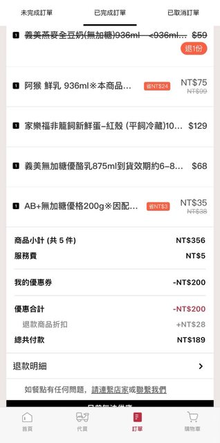 上禮拜天看了這篇文第一次用foodomo 覺得APP跟uber比起來比較卡一點 看在家樂福400折200的份上還是用了 整體購物流程還可以 產品沒有比較貴 阿猴鮮奶特價75跟現場一樣價錢 我自己是買家裡常喝的奶類為主 但大家要注意一點 如果商品有缺貨他退款只會部分退款 不是完整退款 https://i.imgur.com/L6owp6m.jpeg