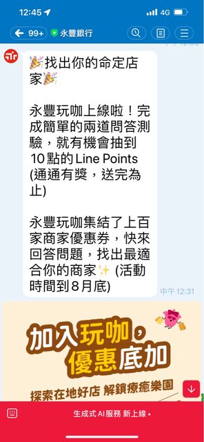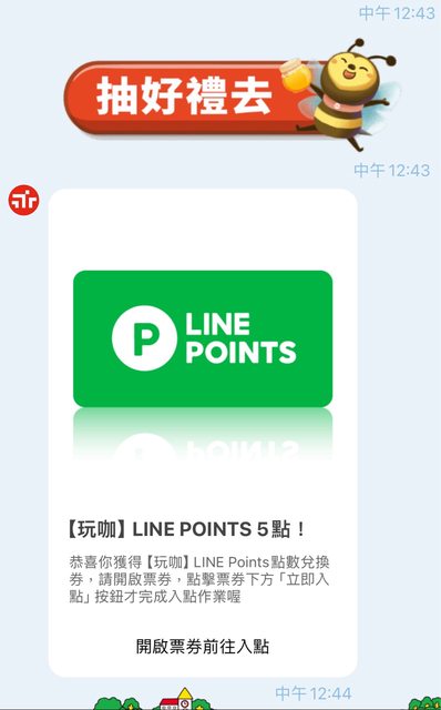 剛看到line跳出永豐銀行遊戲答題拿點數、最高10點、實測拿5點,分享給大家 https://i.imgur.com/pefKjLG.jpeg