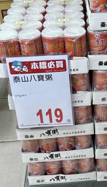 鳳山大潤發泰山八寶粥總算降到119元(6罐),跟大家分享。