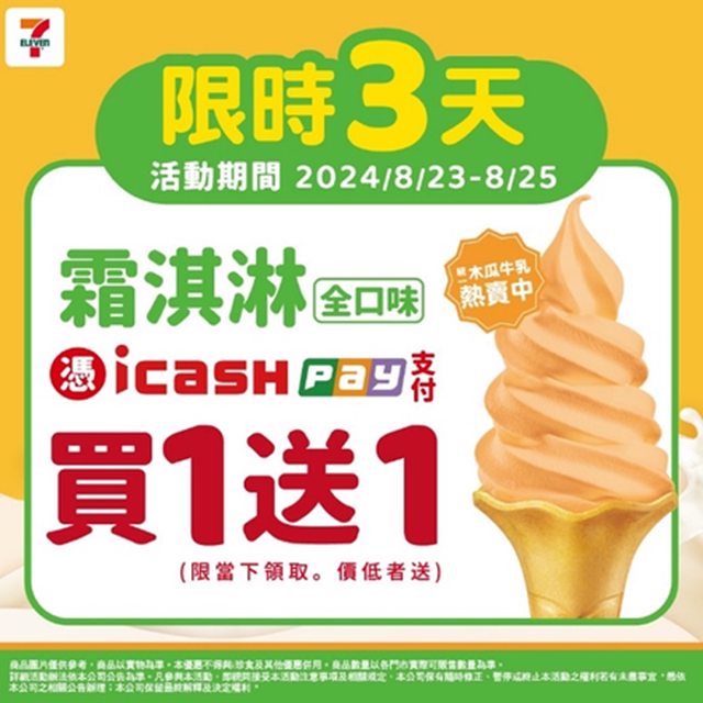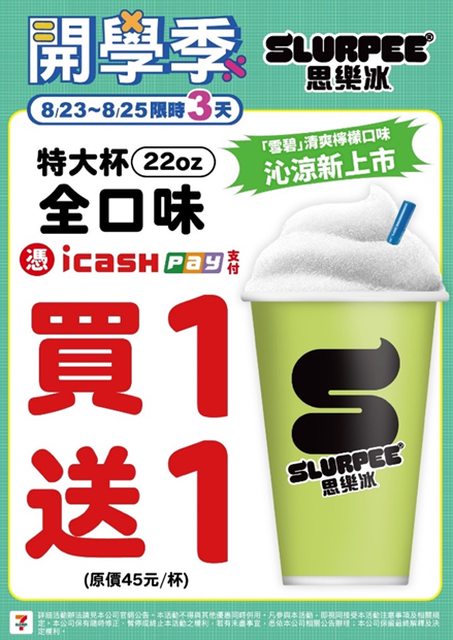 思樂冰&霜淇淋買一送一來了 記得用icash Pay才有 活動期間:2024/8/23-8/25 https://i.imgur.com/FoUF1cK.jpg