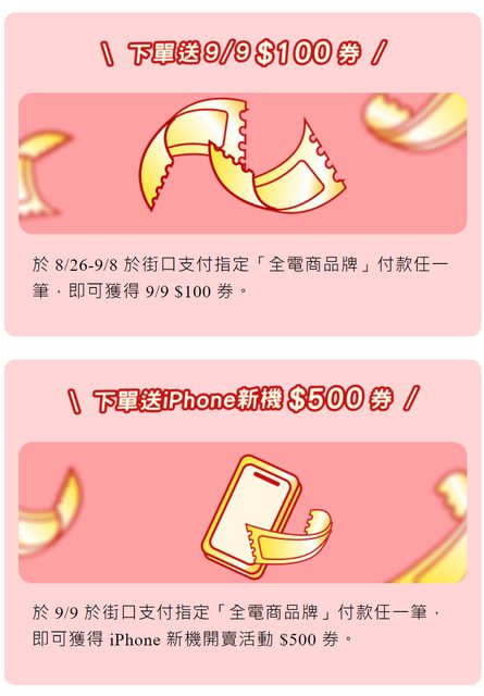 →下單狂送街口券 1.活動辦法:8/26-9/8於街口支付指定「全電商品牌」 付款任一筆即可獲得9/9 $100券。 (此券消費滿$1000可折抵$100。每人限折抵一次,限量1000名) 2.活動辦法:9/9於街口支付指定「全電商品牌」 付款任一筆即可獲得iPhone新機開賣活動 $500券。 (此券消費滿$10,000可折抵$500。每人限折抵一次,限量100名) https://i.imgur.com/LCQDHI8.png