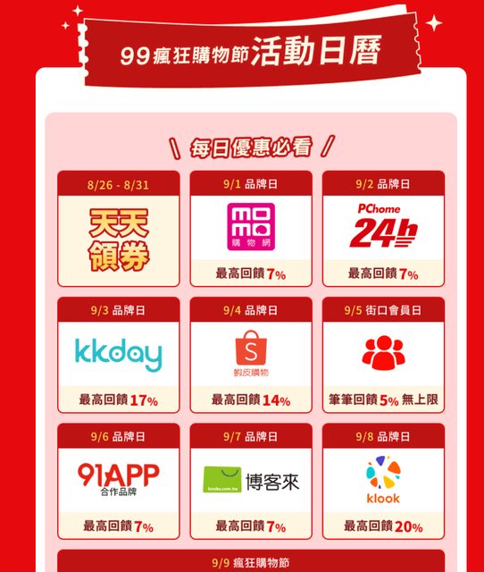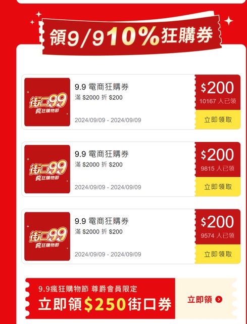 → 9/9電商狂購券(每人每張限折抵一次,數量有限) 1. 領券時間:8/26-9/9 2. 活動辦法:會員可領取「9.9電商狂購券」共計三張,單筆消費滿$2000可折抵$200。 https://i.imgur.com/oFA9VzD.png