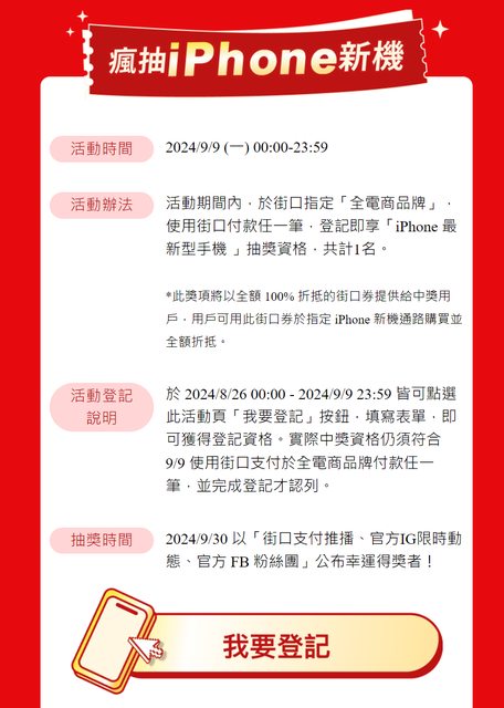 ▲瘋大獎:9/9當天下單就抽最新iPhone手機 活動時間:9/9(一)00:00-23:59 活動辦法:活動期間內,於街口指定「全電商品牌」,使用街口付款任一筆,登記及享「 iPhone最新型手機」抽獎資格,共計1名。 https://i.imgur.com/ttuot8o.png
