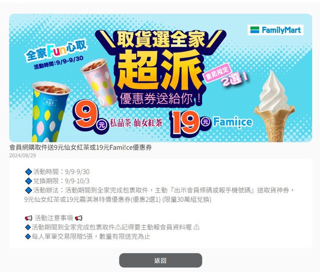 品項換仙女紅茶(這不會太澀太甜我也常喝XD,用9塊買有省 19元的霜淇淋優惠也還有,二擇一 是說全家這幾次優惠時間都頗長(感覺也比小7久?!這點蠻好,很少會錯過了 活動時間:9/9-9/30, 活動期間到全家完成包裹取件,主動出示會員條碼或報手機號碼送 9元仙女紅茶或19元霜淇淋特價優惠券(2選1) 兌換期限:9/9-10/3 -- ※ 發信站: 批踢踢實業坊(www.ptt-web.org.tw), 來自: 1.200.66.128 (臺灣) ※ 文章網址: https://www.ptt-web.org.tw/Lifeismoney/M.1724987341.A.482