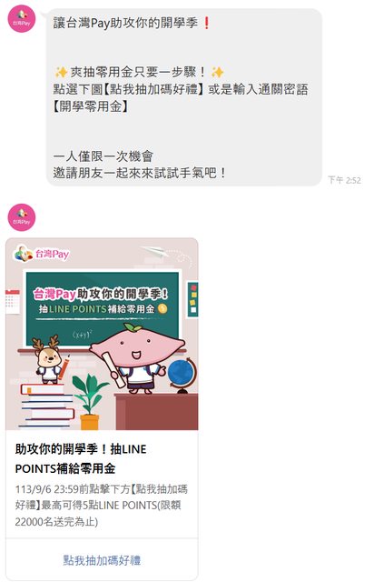 Line訊息跳出台灣Pay開學季可以抽獎 秒按秒抽 我只抽到1元 看有沒有天選之人可以抽到5元! -- ※ 發信站: 批踢踢實業坊(www.ptt-web.org.tw), 來自: 61.224.192.131 (臺灣) ※ 文章網址: https://www.ptt-web.org.tw/Lifeismoney/M.1725011591.A.428