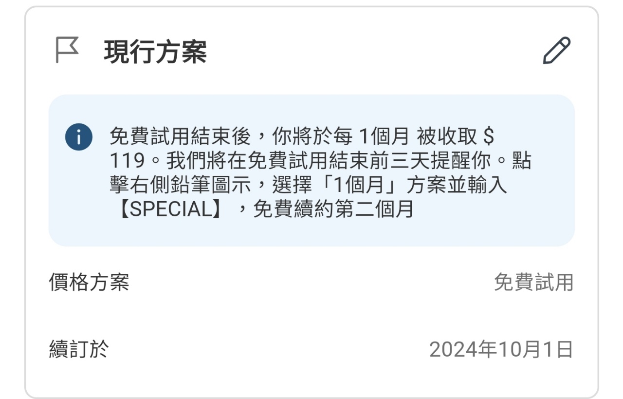 taco0234: 剛剛測試第一個月訂閱先套用優惠券 211.72.223.20 09/01 17:05