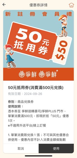 就可以領 滿500 折 50 優惠券一張 https://i.imgur.com/3bM8vca.jpeg