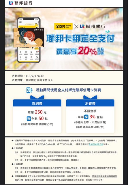 3.全支付首次綁定「聯邦信用卡」 全支付:消費250元 回饋50點 說明網址https://reurl.cc/1bvabX 4.因為這邊要綁聯邦信用卡 所有不會有一般的「1.5%」+帳戶扣款「2%」 變成聯邦信用卡活動的3% https://i.imgur.com/QisCp3p.jpeg