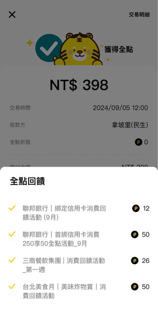 消費398元 綁定聯邦卡combo全支付活動 回饋總共拿138點 所以一個大披薩130元~ 應該是目前在「台北」拿坡里消費 回饋最高的方式~ 1.在「台北」拿坡里門市 全支付:16.5% 單筆最高50點 9/1-9/30最高100點 說明網址https://reurl.cc/0dv8p6 https://i.imgur.com/rcbyUAb.jpeg