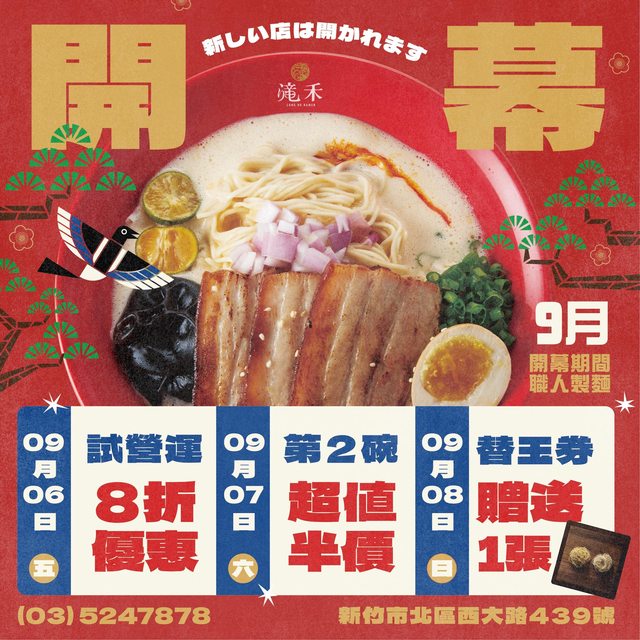 時間 : 9/6(五)~9/8(日),11:30~22:00 地點 : 新竹市北區西大路439號 優惠 : 9/6,全品項8折 9/7,第二碗半價。可選擇不同口味,價低者折價 9/8,贈送替玉券。下回消費可免費加麵1球 理由 : 慶開幕 https://i.imgur.com/EOaCPb2.jpeg
