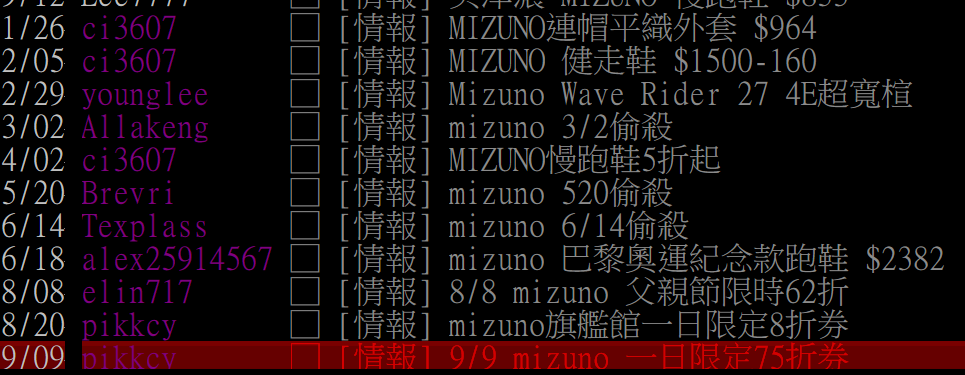 G4321: 其實美津濃 好像一整年都有優惠220.138.126.219 09/09 14:22