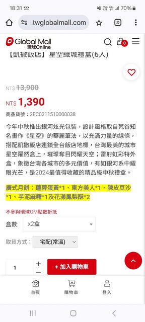 ※ 引述《y02112 (棉花糖)》之銘言: : https://gmonline.twglobalmall.com/product/2EC0211510000038 : 剛好要送禮月餅 : 逛環球購物中心的線上購物平台, : 發現凱撒飯店月餅這平台跟momo一樣一盒就免運, : 一組1390,兩組也是1390 : 不確定是不是兩組1390系統錯誤這樣一組700不到很划算, : 先買兩組來送禮,期待能出貨, : 附上購買圖 : https://i.imgur.com/20nvf8F.jpeg