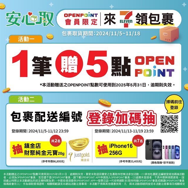 標題[情報] 11/5~18 7-11安心取件加碼贈OPENPOINT5點
