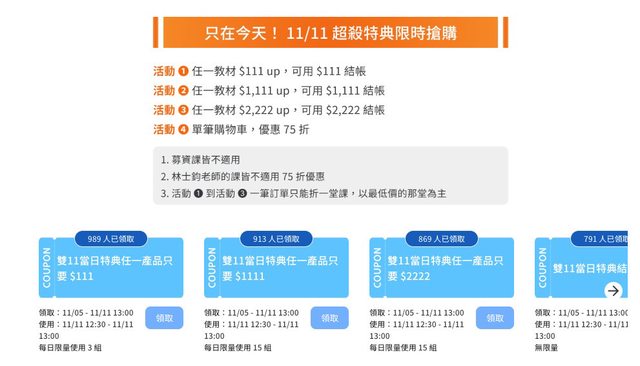 1. 今天 18:30 單一商品超過 $1,111 的教材,可直接以 $1,111 的價格結帳(限量15份)