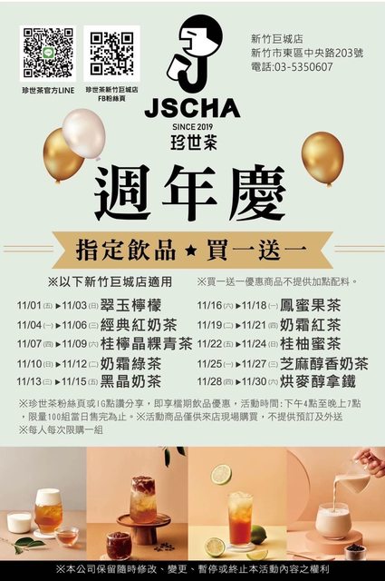 標題[情報] 新竹市:珍世茶,部分飲品買一送一