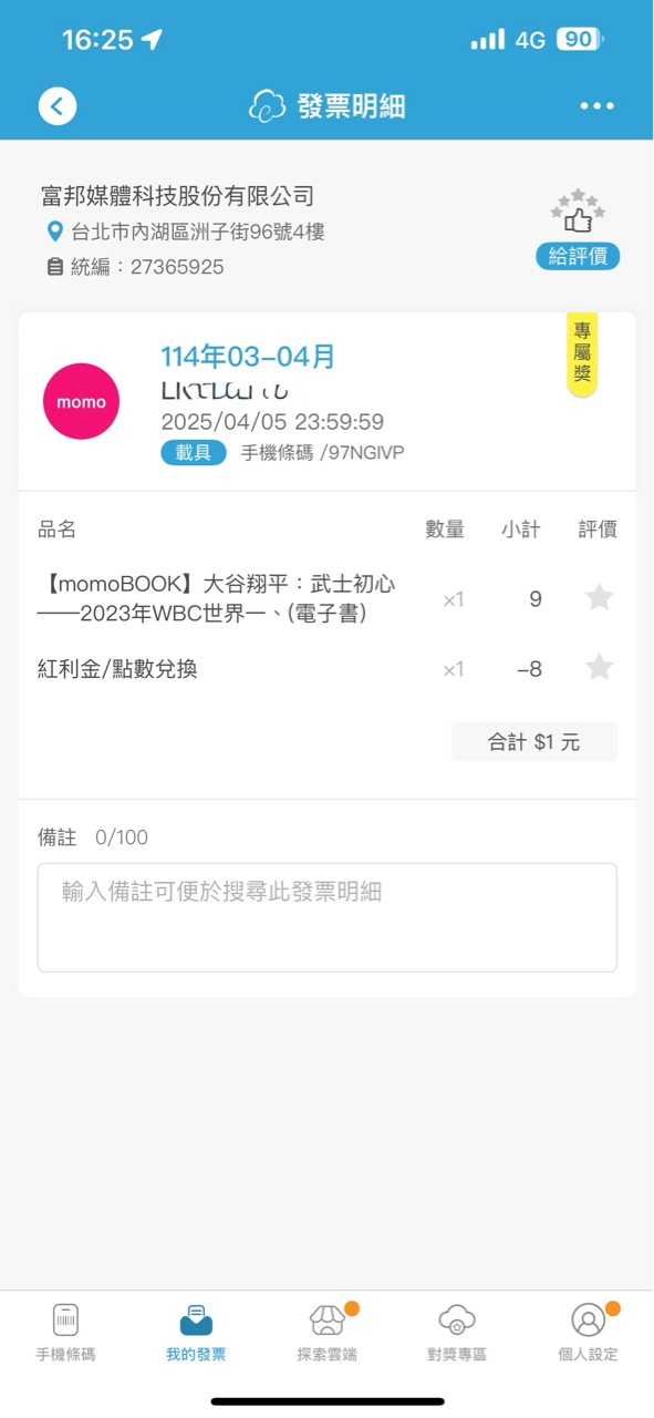 推 kintaro1219: 有收到,等簽momo幣,一元買發票 123.193.184.51 06/05 20:31