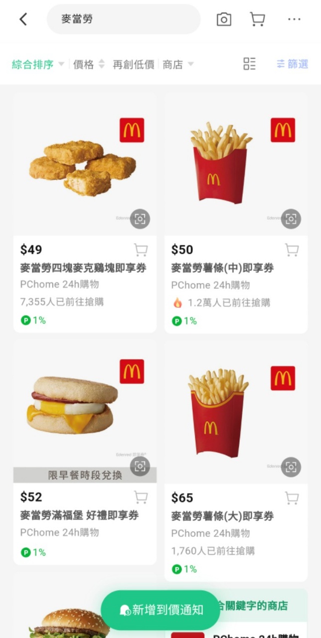 推 oyaji5566: 我是Pchome24買1%的麥當勞票券 223.137.81.235 06/12 14:14