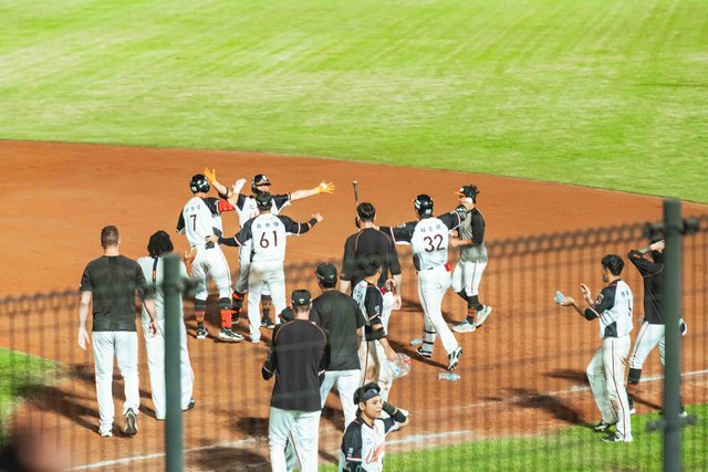 互相擁抱的統一獅球員。