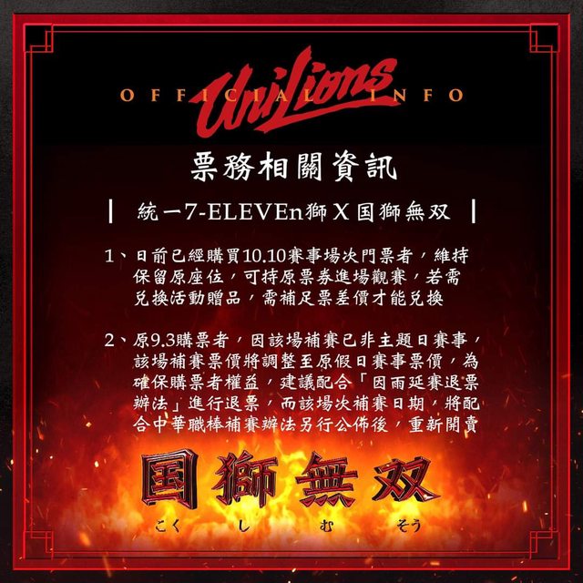2、原9.3賽事購票者,因該場補賽已非国獅無双主題日賽事,該場補賽票價將調整至假日賽