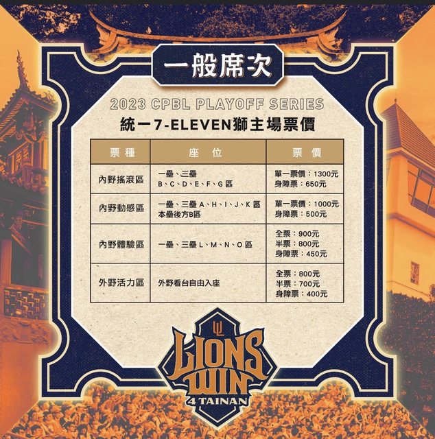 https://pse.is/5ara3t 中華職棒34年季後挑戰賽 統一7-ELEVEN獅主場賽事門票 準備開搶!!!搶起來! . ▍售票資訊 ▍ ▶ 豪華季票優先購票: 10.23 一 18:00~19:59 ▶ 一般季票優先購票: 10.23 一 20:00~21:59 ▶ 2023獅卡會員優先購票: 10.24 二 12:00~17:59 ▶ 兆豐聯名卡優先購票: 10.24 二 18:00~23:50 ▶ 全面開賣: 10.25 三 12:00起 ▍賽程資訊 ▍ ▶ Game1: 10.28 六 17:05 樂天桃猿vs.統一獅 台南 ▶ Game3: 10.30 一 18:35 樂天桃猿vs.統一獅 台南 ▶ Game4: 10.31 二 17:35 樂天桃猿vs.統一獅 台南 季後挑戰賽採五戰三勝制 季冠軍獅隊享有一勝優勢 Game3及Game4將視戰況成績進行 若晉級隊伍確認,#未進行賽事 全面進行退票 ▍購票贈品 ▍ 「臺南400聯名大橘運動毛巾」一條 (市價350元) 「臺南400聯名大橘運動束口袋」一個 (市價250元) ▶ 款式: 10.28應援毛巾為UNILIONS款式 10.30應援毛巾為UNILIONS款式 10.31應援毛巾為台南款式 ▶ 兌換資格:凡當日賽事 #有價票券 均可排隊兌換 #人手一組大橘應援道具力挺到底 ▍票價資訊 ▍ ▶ 售票平台:全台統一超商ibon機台或ibon售票網站 ▶ 內野搖滾區 座位:一壘、三壘B、C、D、E、F、G區 單一票價:1300元/席 愛心身障票:650元/席 . ▶ 內野動感區 座位:一壘、三壘A、H、I、J、K區及本壘B區 單一票價:1000元/席 愛心身障票:500元/席 . ▶ 內野體驗區 座位:一壘、三壘區域L、M、N、O 全票:900元/席 半票800元席 愛心身障票:450元/席 . ▶ 外野活力區 座位:外野自由席 #無劃位 全票:800元/席 半票:700元/席 愛心身障票:400元/席 ▶ 鑽石席 票價:1500元/人 席次:185席 內容:一壘牛棚區旁,提供手套租借及冰品、礦泉水 ▶ 家庭席 票價:7000元/5人 席次:6席 內容:本壘後方,提供桌椅、炸雞、PIZZA及飲料,供5人進場入座 ▶ 單人球探席 票價:1400元/人 席次:12席 內容:本壘後方,提供桌椅,球賽記錄表、猛獅文件夾及點心各1份,提供手機充電插座 ▶ 雙人球探席 票價:2800元/2人 席次:24席 內容:本壘後方,提供桌椅,球賽記錄表、猛獅文件夾及點心各2份,提供手機充電插座 ▶備註: 本系列賽事 #無外野學生參觀券 本系列提供外野身障參觀券 #限量兌換,若遇預售滿場將不提供發放 #台南主場維持全主場應援 ▶客隊應援區為三壘N區 -- ※ 發信站: 批踢踢實業坊(www.ptt-web.org.tw), 來自: 27.53.120.113 (臺灣) ※ 文章網址: https://www.ptt-web.org.tw/Lions/M.1698032277.A.55A