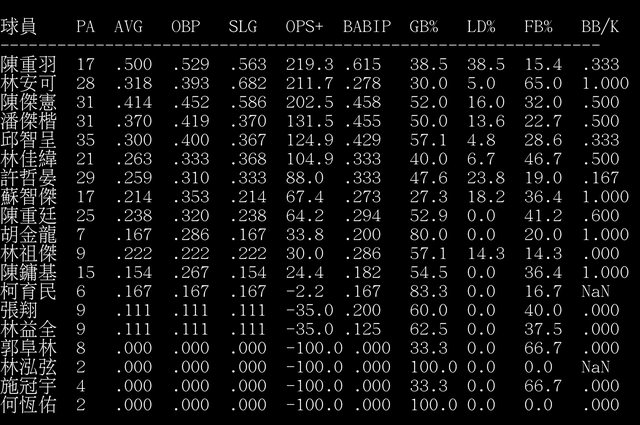 推 e04051130: 拜託明天讓智傑先發,冠宇是不是這季還沒安打? 06/14 22:35