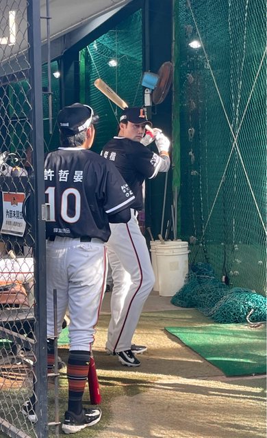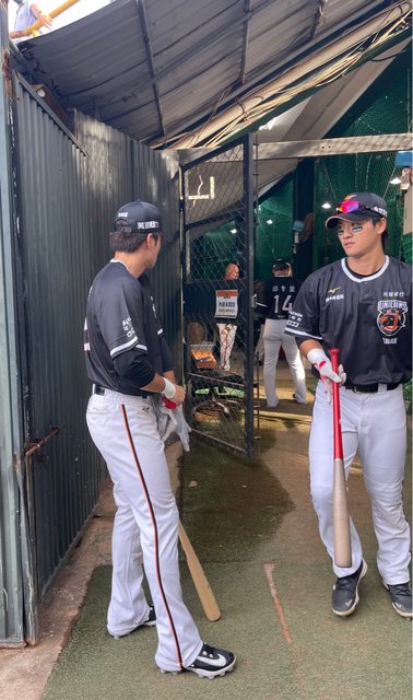 站在一壘側欄杆邊對著下方正準備練打的PJK、妖晏等人