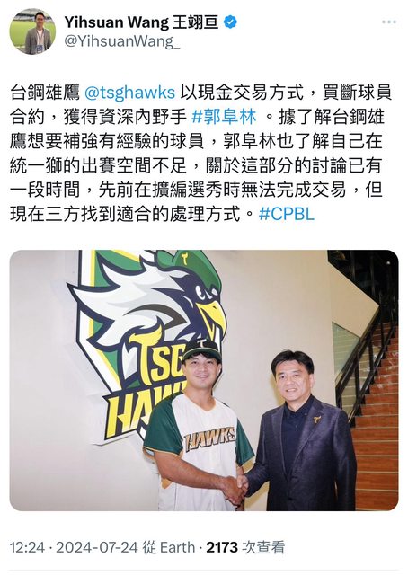 台鋼雄鷹 @tsghawks 以現金交易方式,買斷球員合約,獲得資深內野手 #郭阜林 。據了解