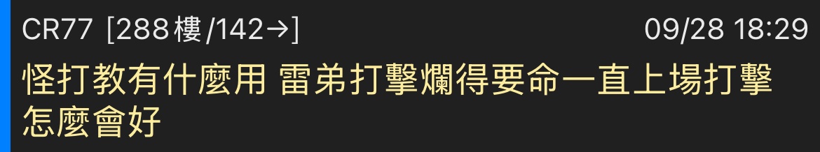 → CR77: 怪打教有什麼用 雷弟打擊爛得要命一直上場打擊怎麼會好 09/28 18:29