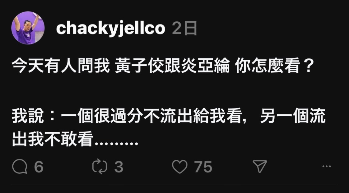 推 kqP5641 : 笑死 貝莉梅在threads說誰覺得黃子佼還好的要封鎖 04/08 15:53