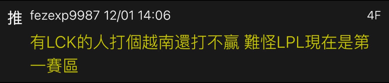 推 fezexp9987 : 有LCK的人打個越南還打不贏 難怪LPL現在是第一賽區 12/01 14:06