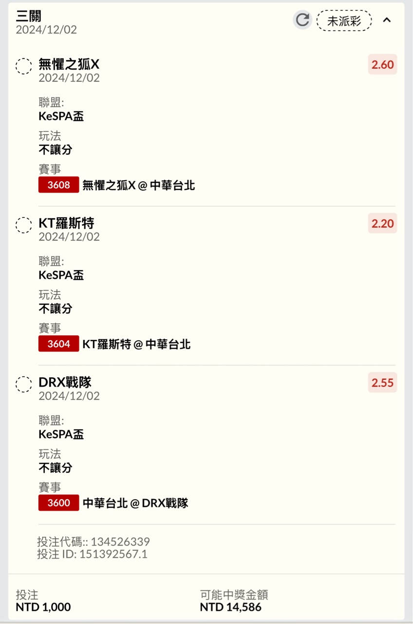 → howdo1793 : 奉勸這種別買 因為幾乎要串兩關 T1打越南1.08輸了 12/02 11:08
