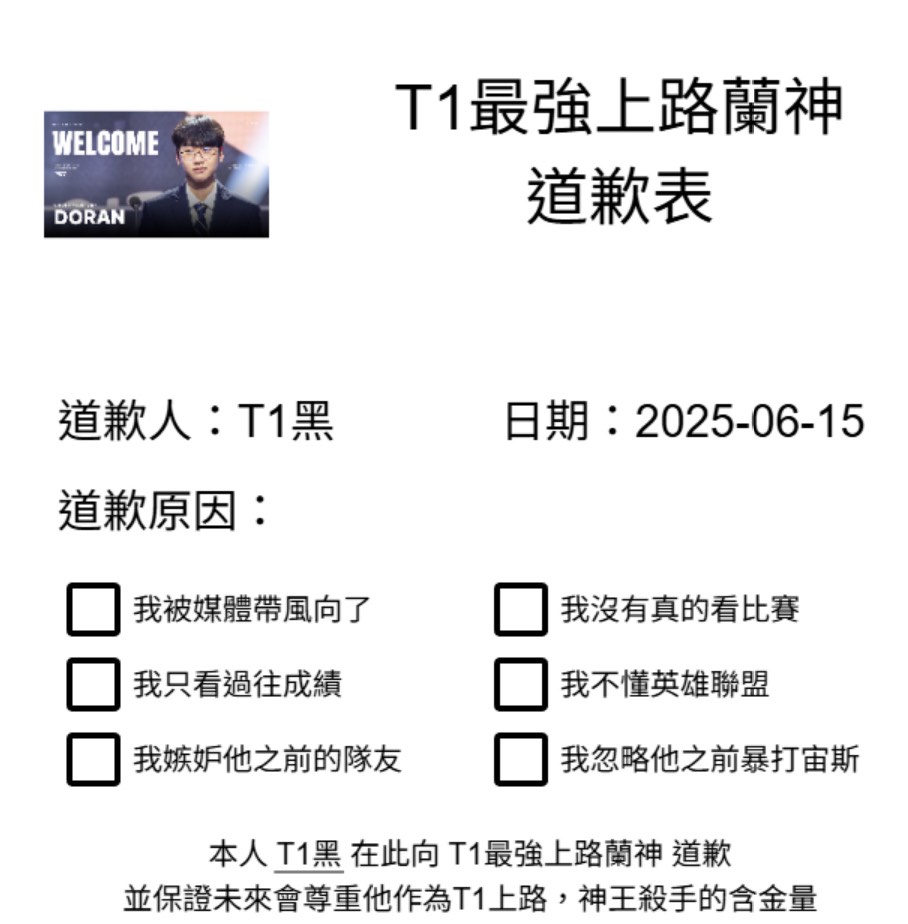 → tim121236 : 由於最近收到太多上路選手 Doran (崔玄準) 的道歉信 06/15 17:03