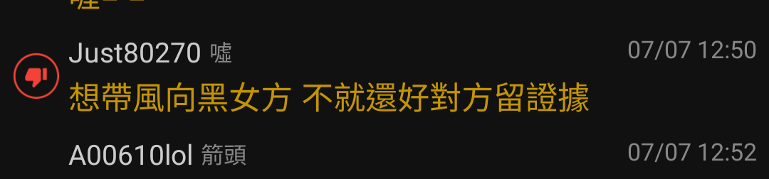 噓 Just80270 : 想帶風向黑女方 不就還好對方留證據 07/07 12:50