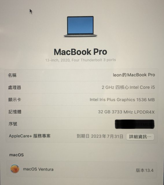 標題[販售] 雙北 二手 2020 MacBook Pro 13吋 i5 保