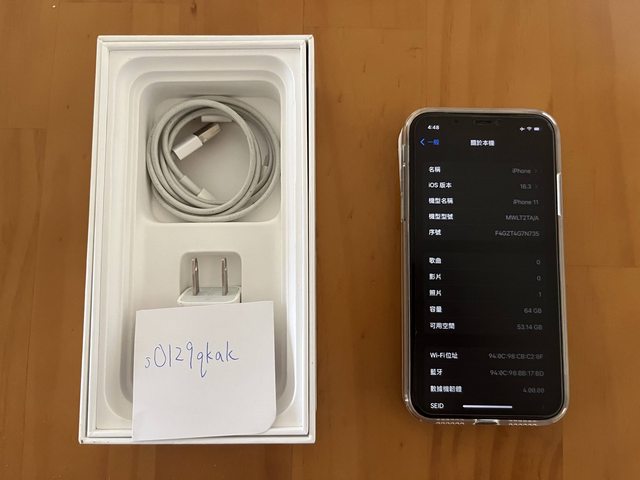 手機、原廠盒、原廠充電線和豆腐頭、原廠耳機轉接線、透明保護殼、鏡頭貼、霧面螢幕貼