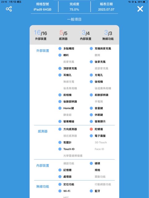 使用手機醫生app測試報告如圖,目前按鍵、喇叭、錄音、熒幕均正常,其中陀螺儀不清