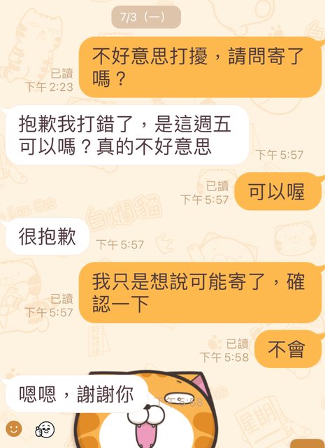 我詢問寄了沒,bookerrr表示出了點問題,週一幫我寄。
