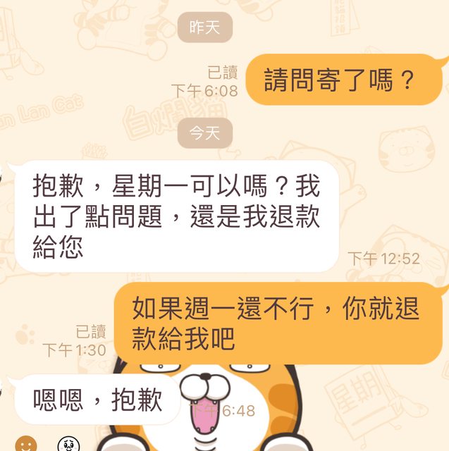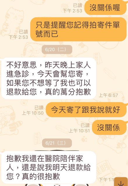 bookerrr表示昨日家人有恙,臨時無法寄,只能改成今日寄出,若不想等可退款。